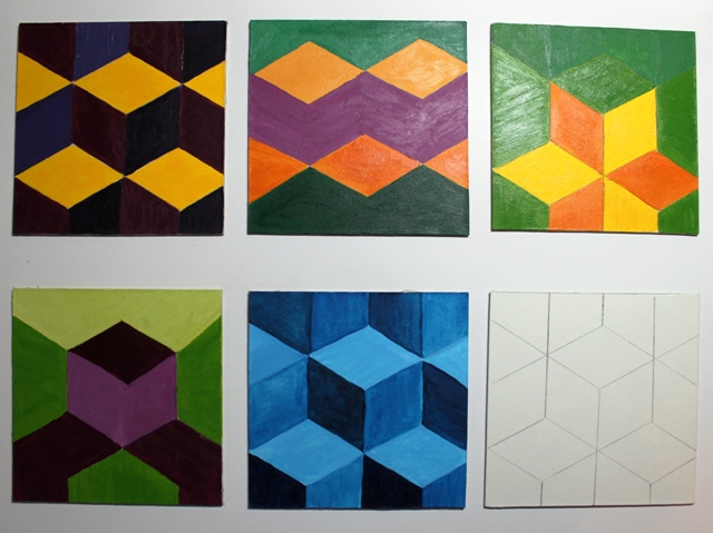 This project was about combining color to create different visual effects on a single geometric design (the black and white line drawing in the photo.) I chose a quilt pattern called “Tumbling Blocks” which can be made to look so many different ways.