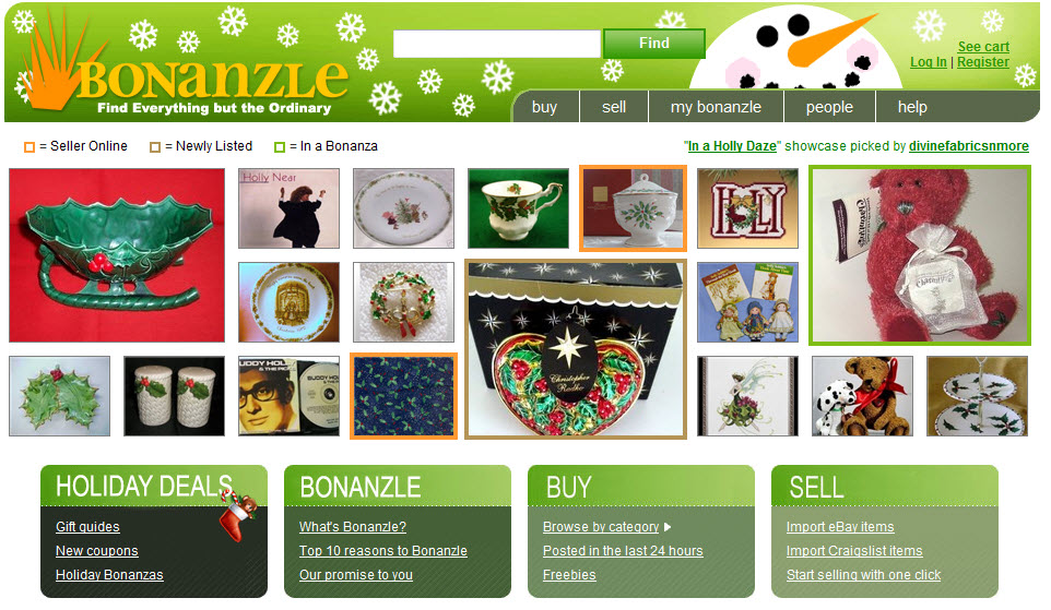 The graphic artist for Bonanzle.com told me that my peeping snowmen inspired her holiday design for the site (how cool is that?):