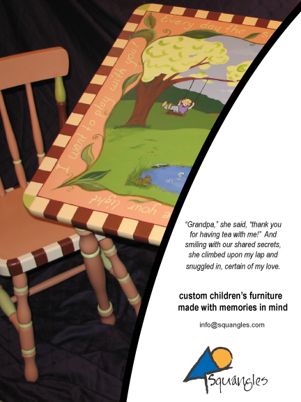 [Note: this is one of my illustrated table and chair sets with Charlotte’s poetry going around the edges. This was commissioned by a chiropractor and now resides in his waiting room, which is decorated in the soft greens.]