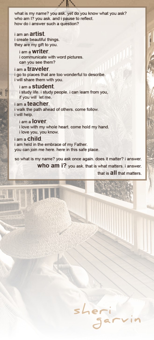 I was tired of writing introductions of myself so I started thinking about it. Next thing you know the project took me over and became a typography exercise! However, the poem that came out of me was what I fell in love with and then it was a matter of finding a photo that would work with the text.