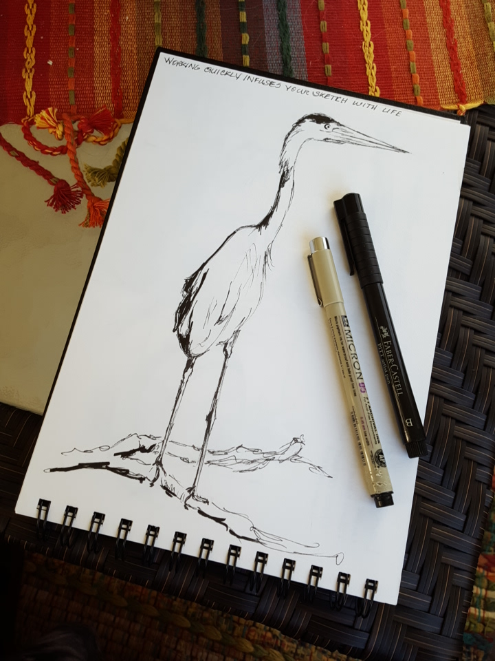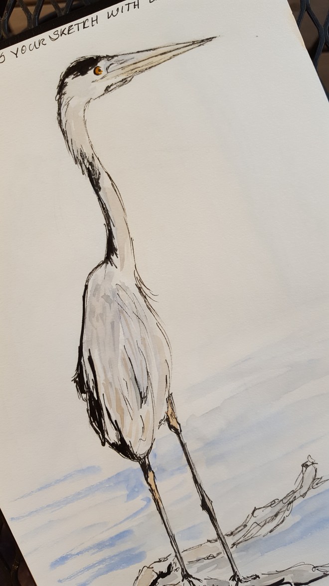 Above is my ink of a blue heron. Below I added light watercolors. Later I added notes and observations in the whitespace.