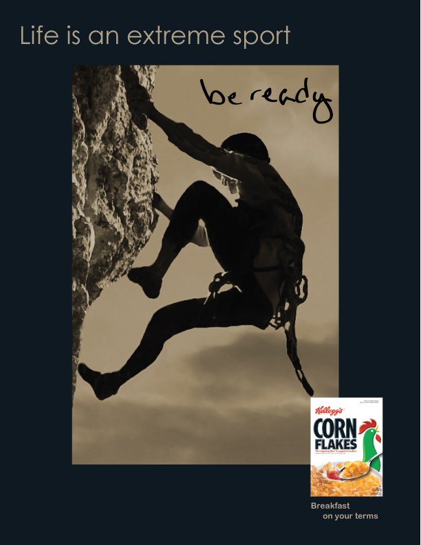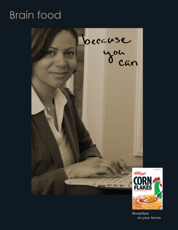 Art Direction was partially a team class and I enjoyed the teams I was put on, even if we were working at warp speed. As a team on the final project we chose to research and promote Kellogg’s Corn Flakes. The team also chose the tagline (which happened to be one I proposed, which was fun.) We then chose our 3 favorite group proposed headlines and general visuals. From there, we each interpreted the final pieces in our individual ways.