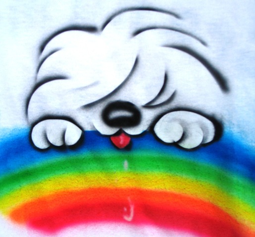 By 1983 I was selling my work locally. It was an eclectic mix because while painting, I was also trying to make enough money to pay for expensive supplies. I was churning out my little puppy on t-shirts and selling them in Hagerstown, Metamora, and Nashville Indiana in order to afford oil paints, brushes and canvases. This is a more current airbrushed version.