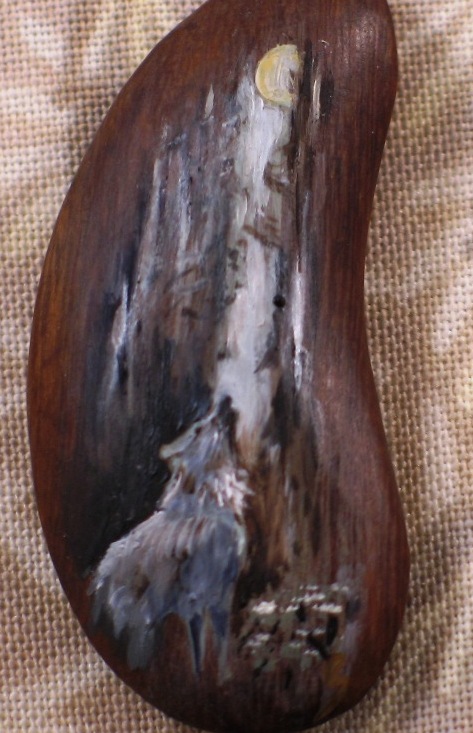 This is a commissioned wooden button. I sometimes use my cat’s whiskers (after they fall out! The rumor that I denude her to do my art work is just that… a rumor!) I also will use a loop of a single strand of my own hair to make the smallest lines.