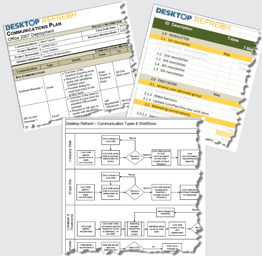 (I love organizing projects!) My portion of the project was to build the communication plan for the IT team running the program, as well as the process flow and work breakdown structure. It was fun to apply a simple branding to what can often be “blah” business documents.