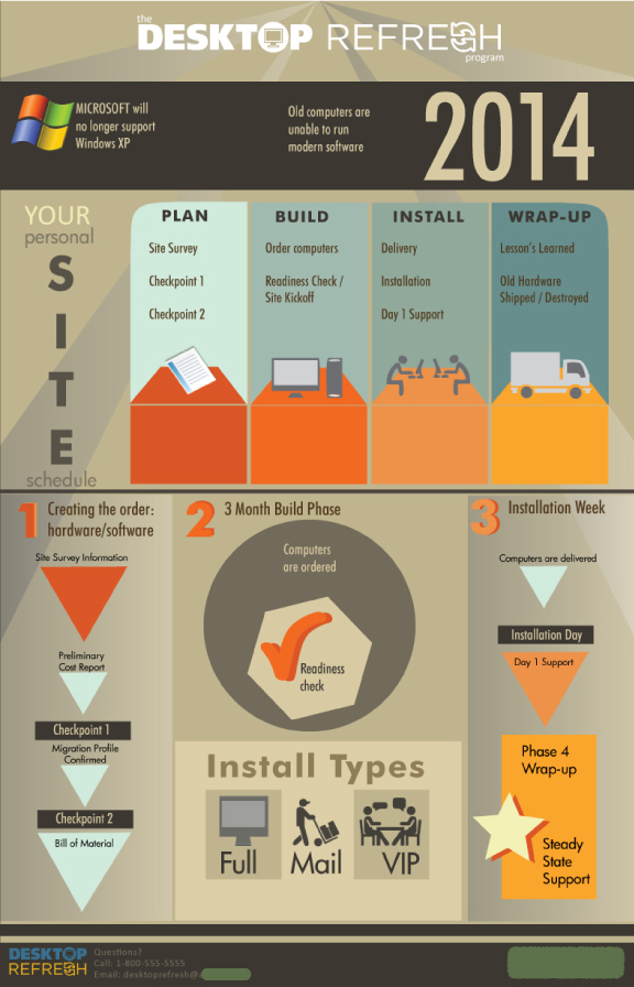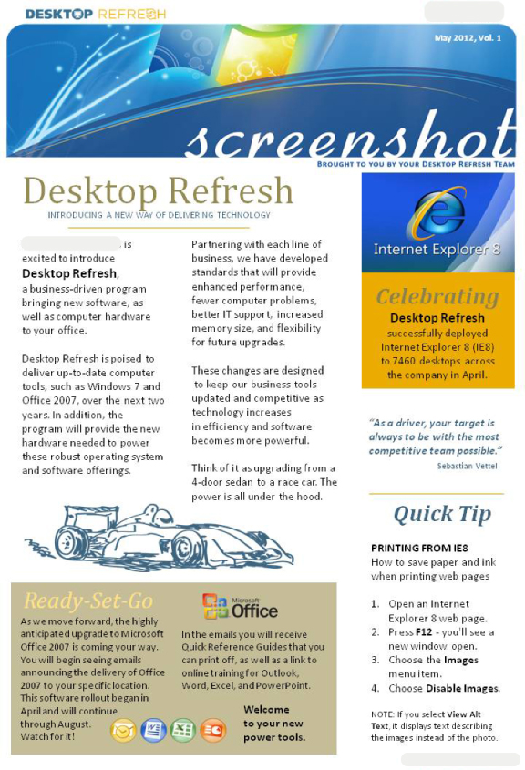 The business was preparing to do a company-wide revamp of their computer systems. That included rolling out around 10,000 new computers across the company. As the project’s Communication Director, I was tasked with creating email blasts as well as their corporate newsletter for the project. This was a Microsoft project, so I leaned on some of Microsoft’s graphics and added some of my own illustrations.
