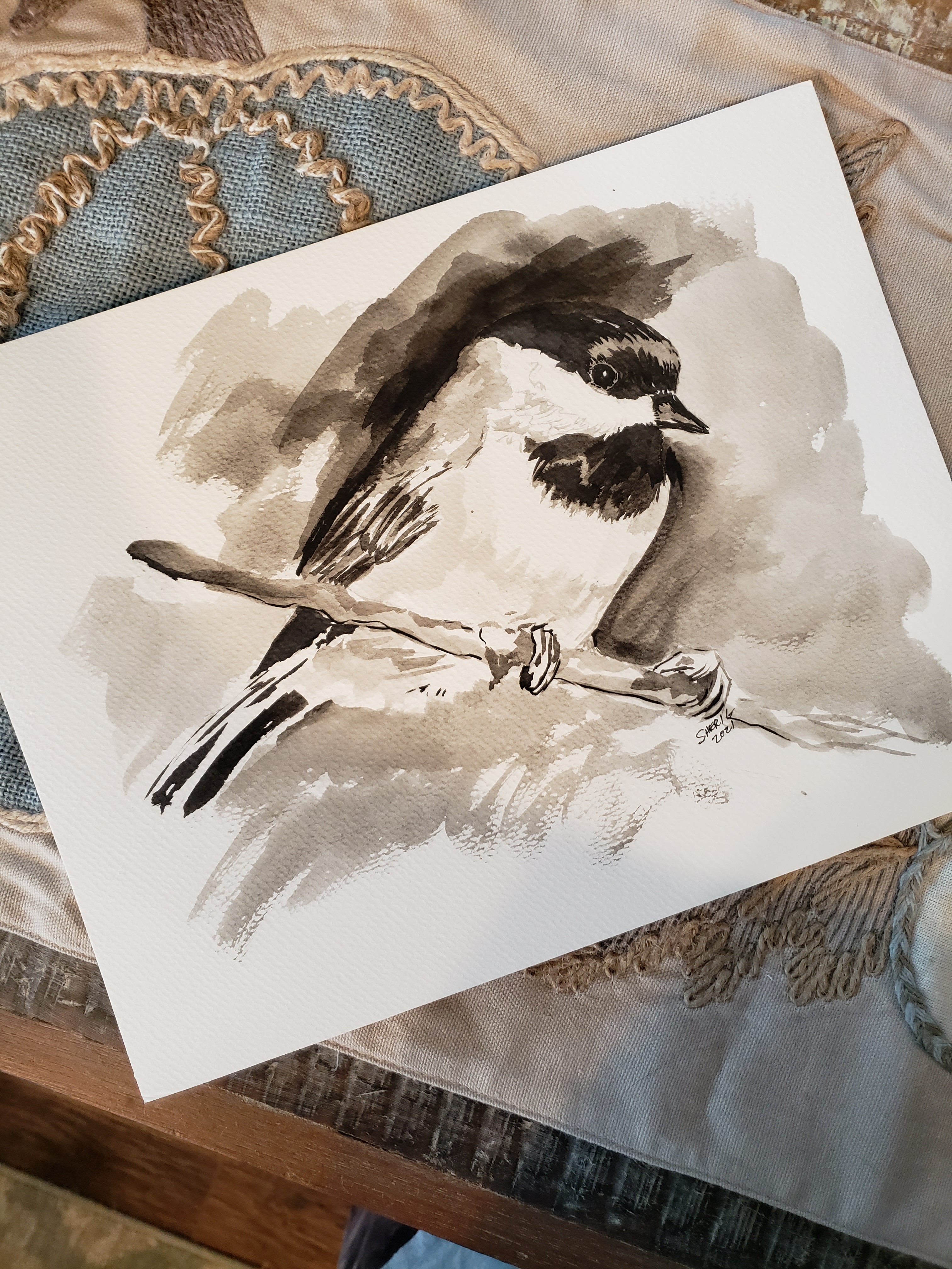 “Chickadees look like they are wearing little suits,” Charlotte exclaimed earlier this week as she watched our favorite little birds at our feeders. I knew then that was perfect for today. I used one of her photos as my source file. What a great example of one of the sweetest daily joys in my world.