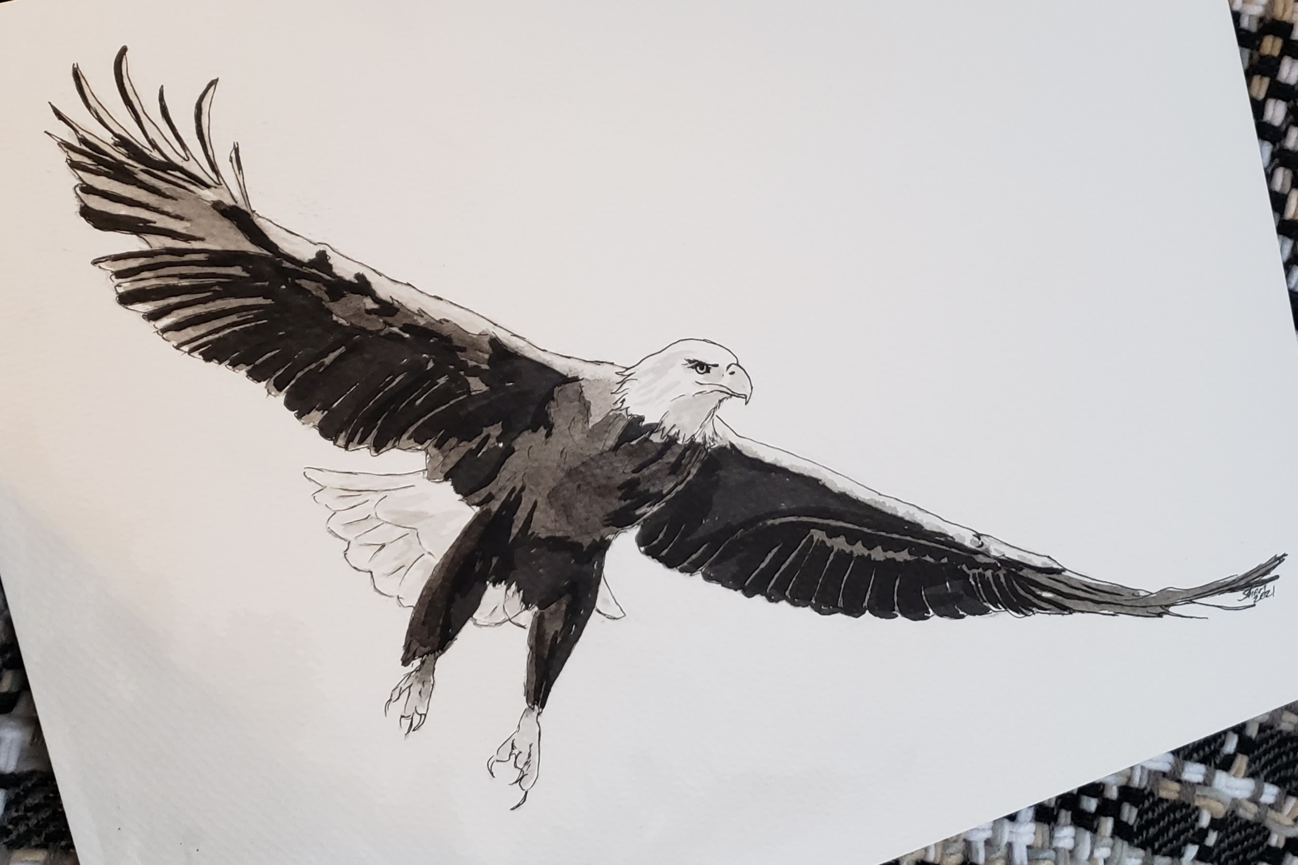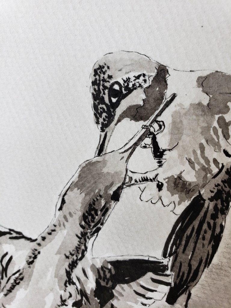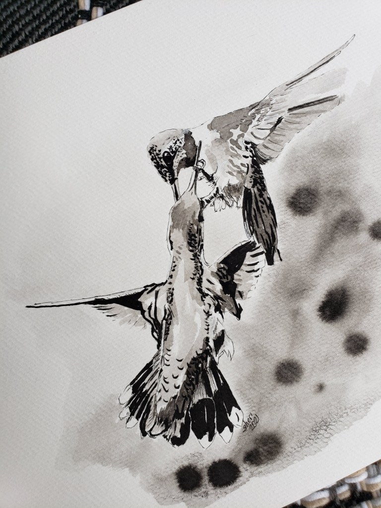 The photo reference comes from a birding friend, Sally Slick, and as soon as I saw it a couple of months ago, I knew I would use it for Inktober. These feisty little birds have fierce battles, but this was a beautiful image of one grabbing the other’s beak.